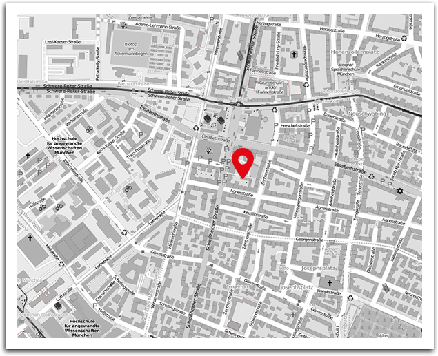 Mit den Tramlinien 12 oder 27 und Buslinien 53/54 bis Nordbad. Die Schleißheimerstraße über Elisabethstraße bis Agnesstraße folgen. Links in Agnesstrasse bis Hausnummer 54. (5min.)